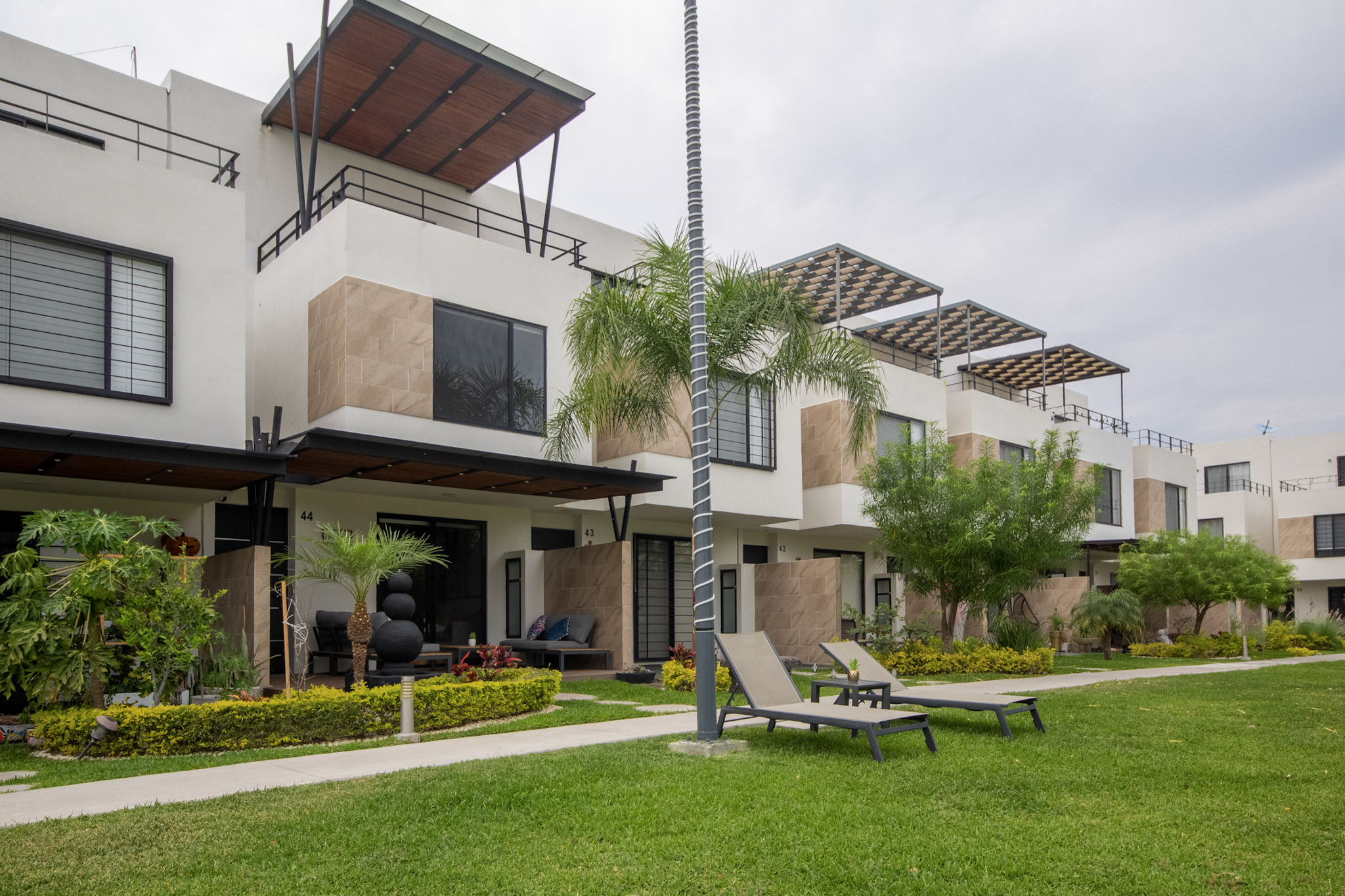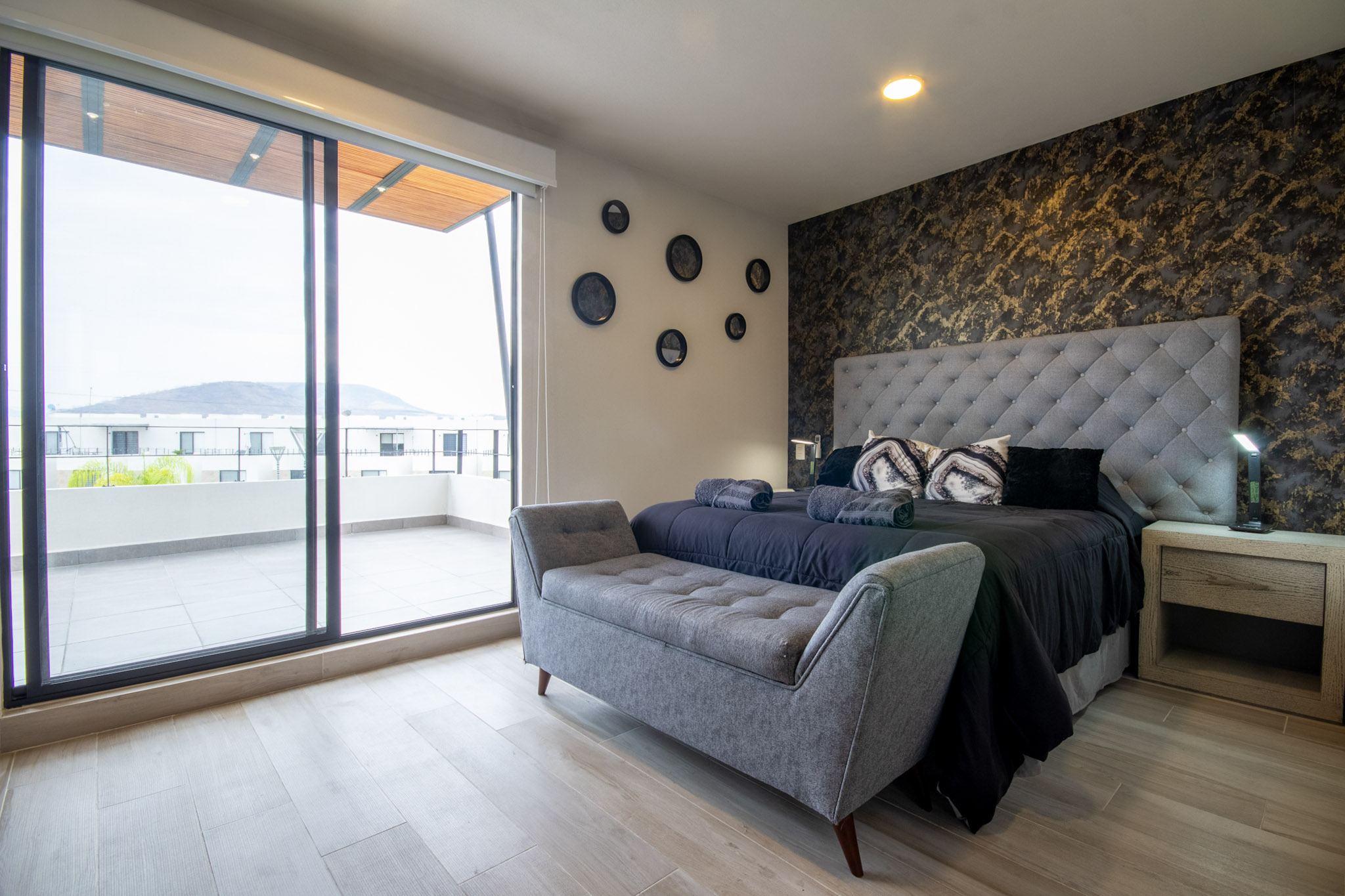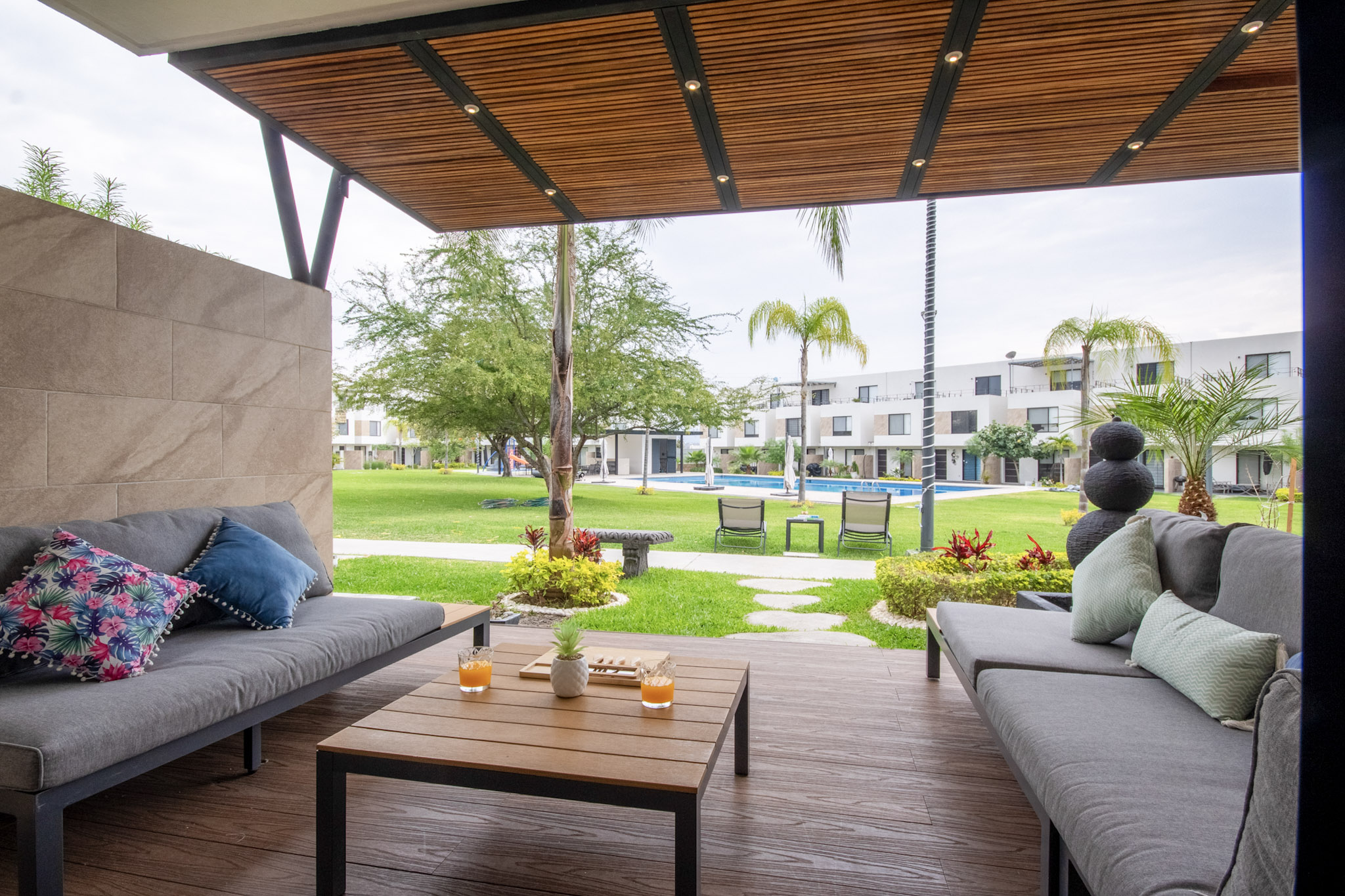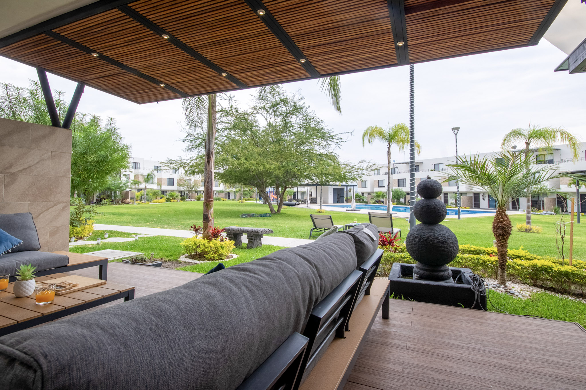 Recamara 1: 1 cama matrimonial, closet con ganchos, baño completo dentro de la habitación, espectacular terraza con vista hacia el jardin y alberca, con un bello sofá y 2 camastros en la terraza.