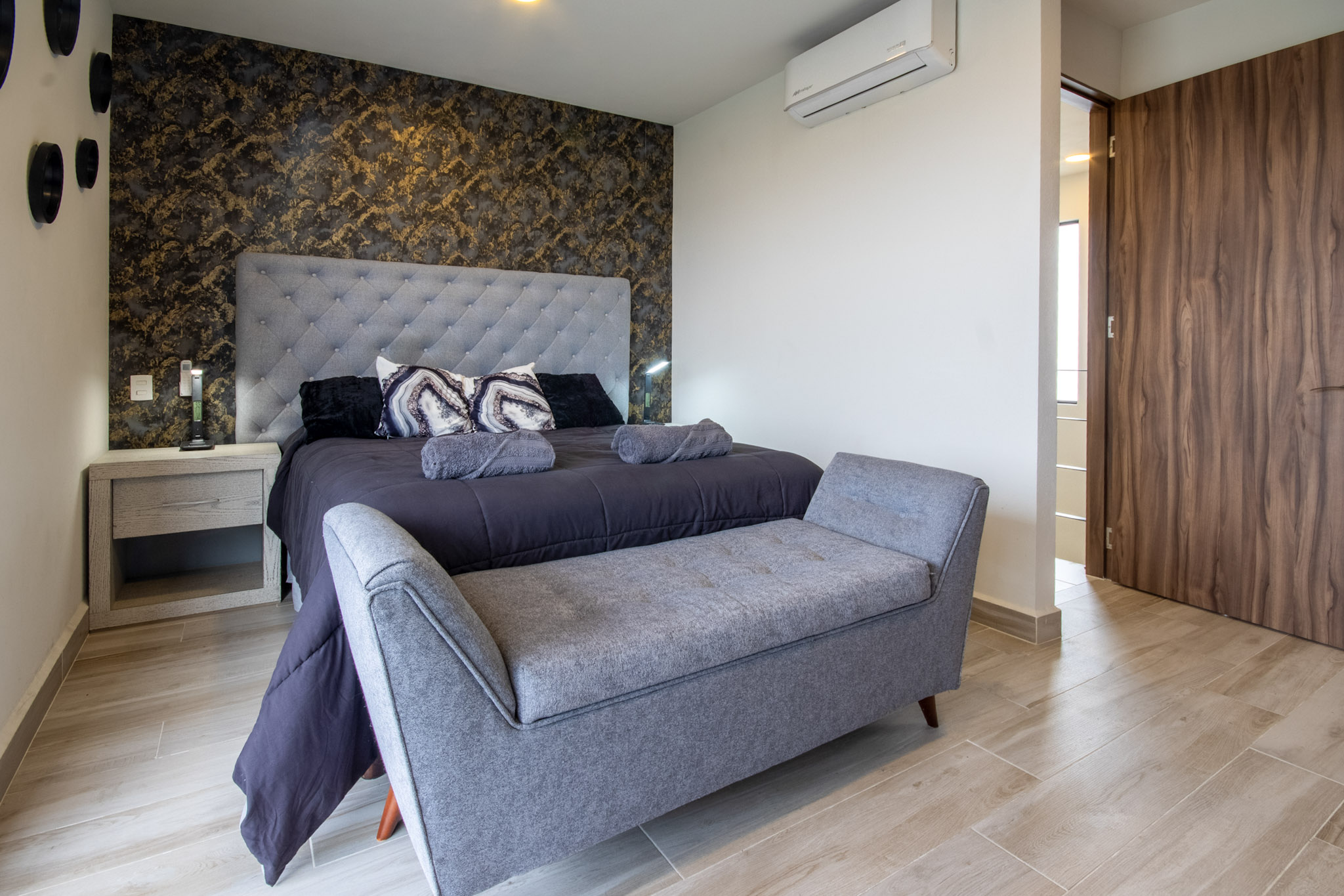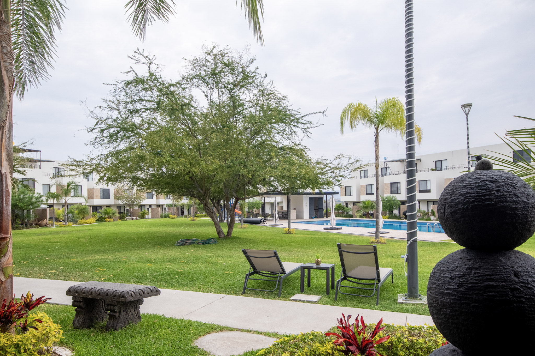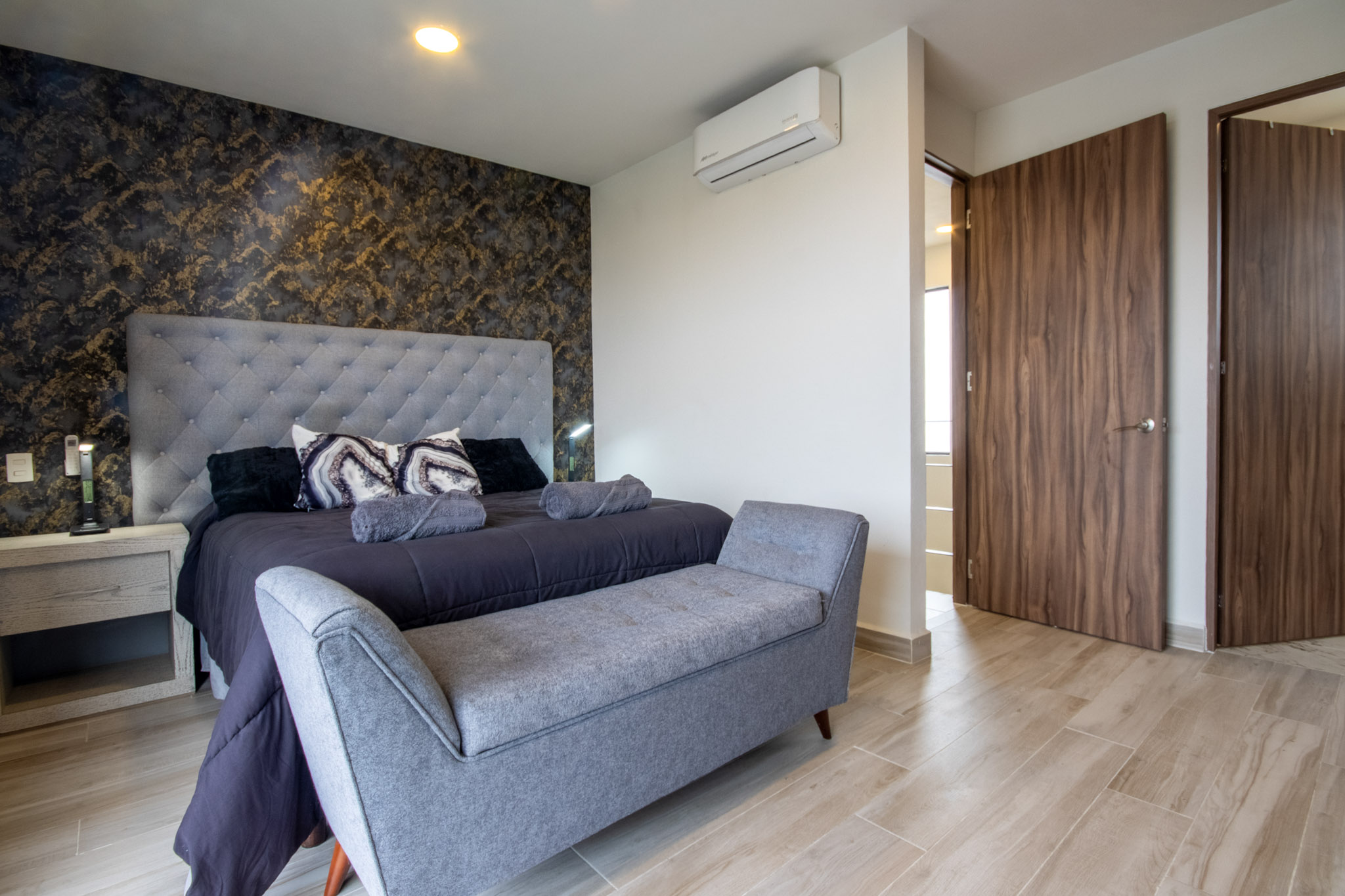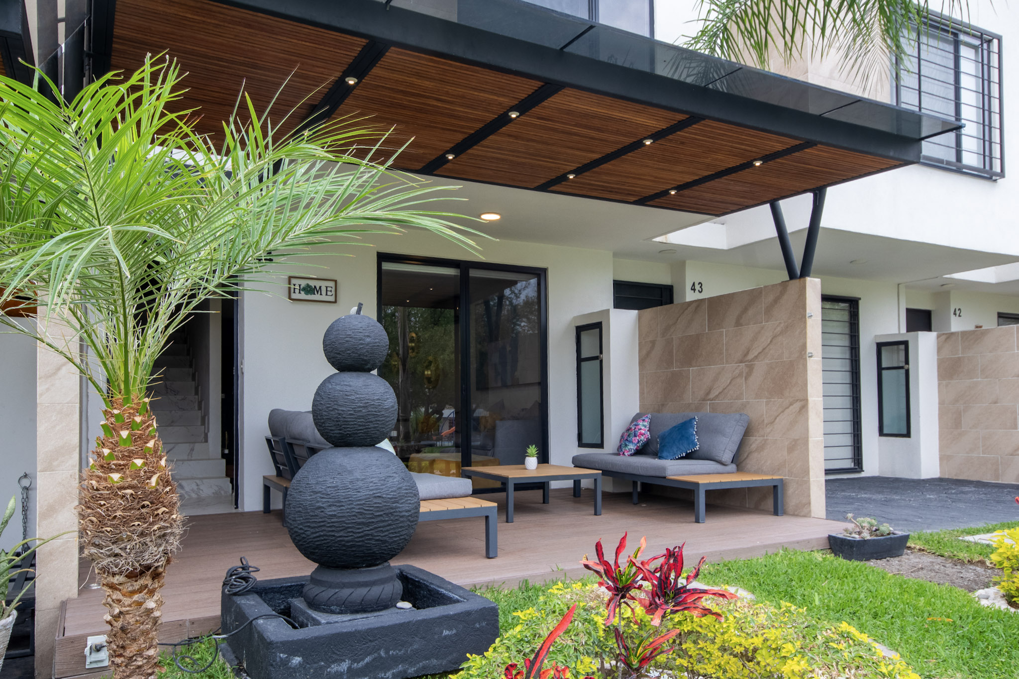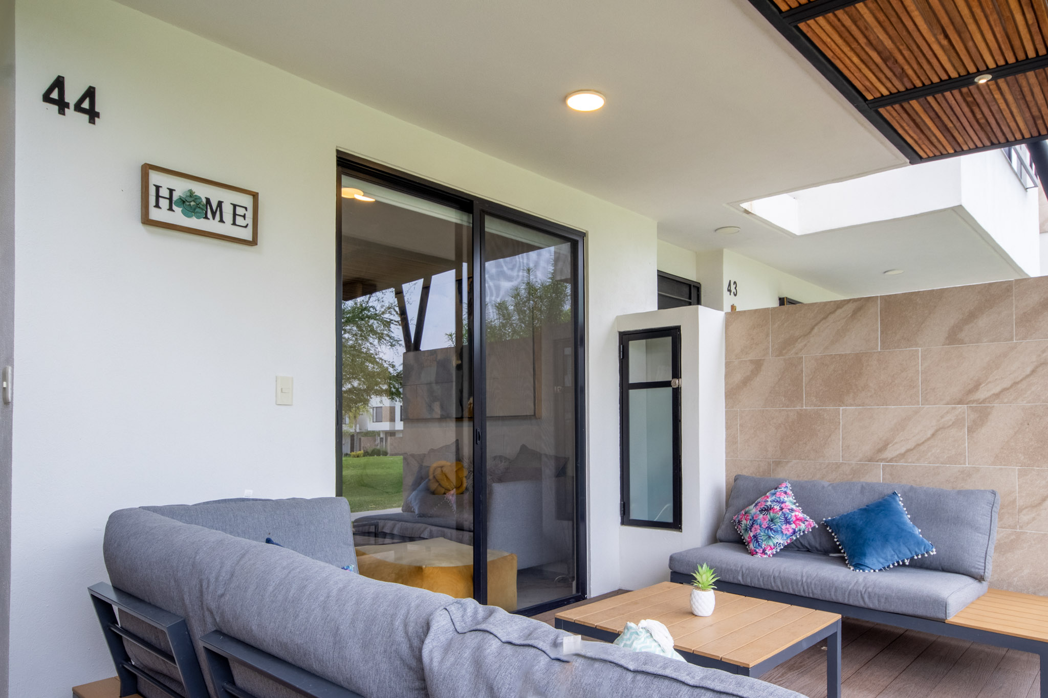 Recamara 1: 1 cama matrimonial, closet con ganchos, baño completo dentro de la habitación, espectacular terraza con vista hacia el jardin y alberca, con un bello sofá y 2 camastros en la terraza.