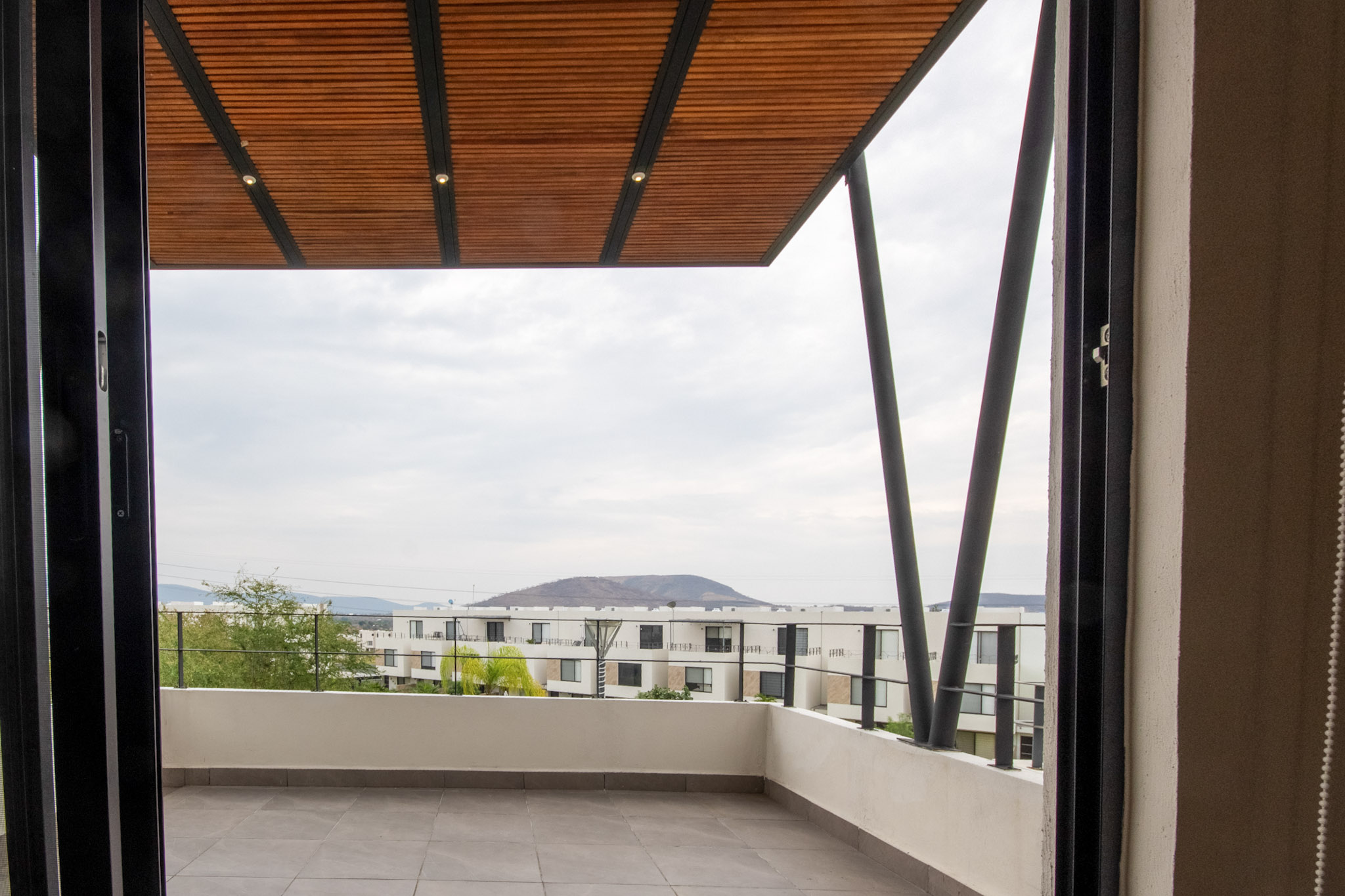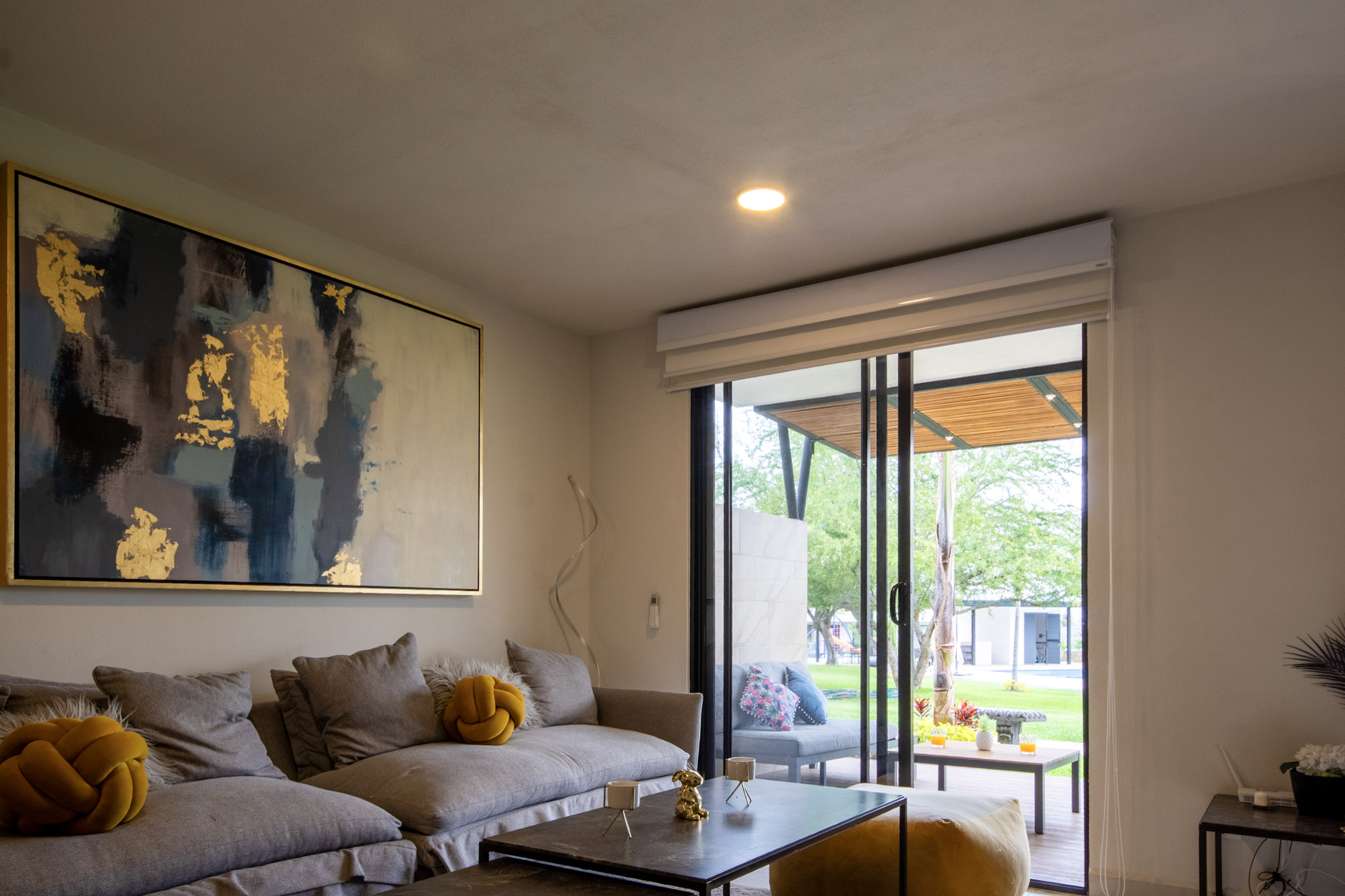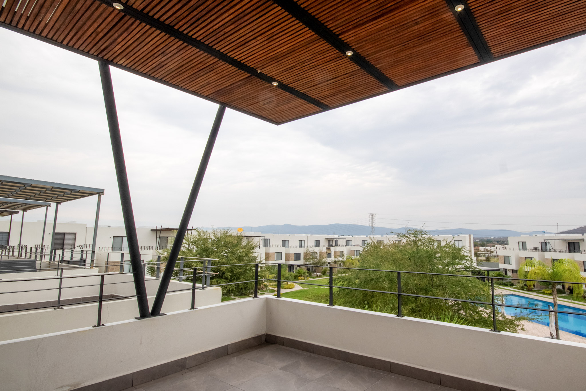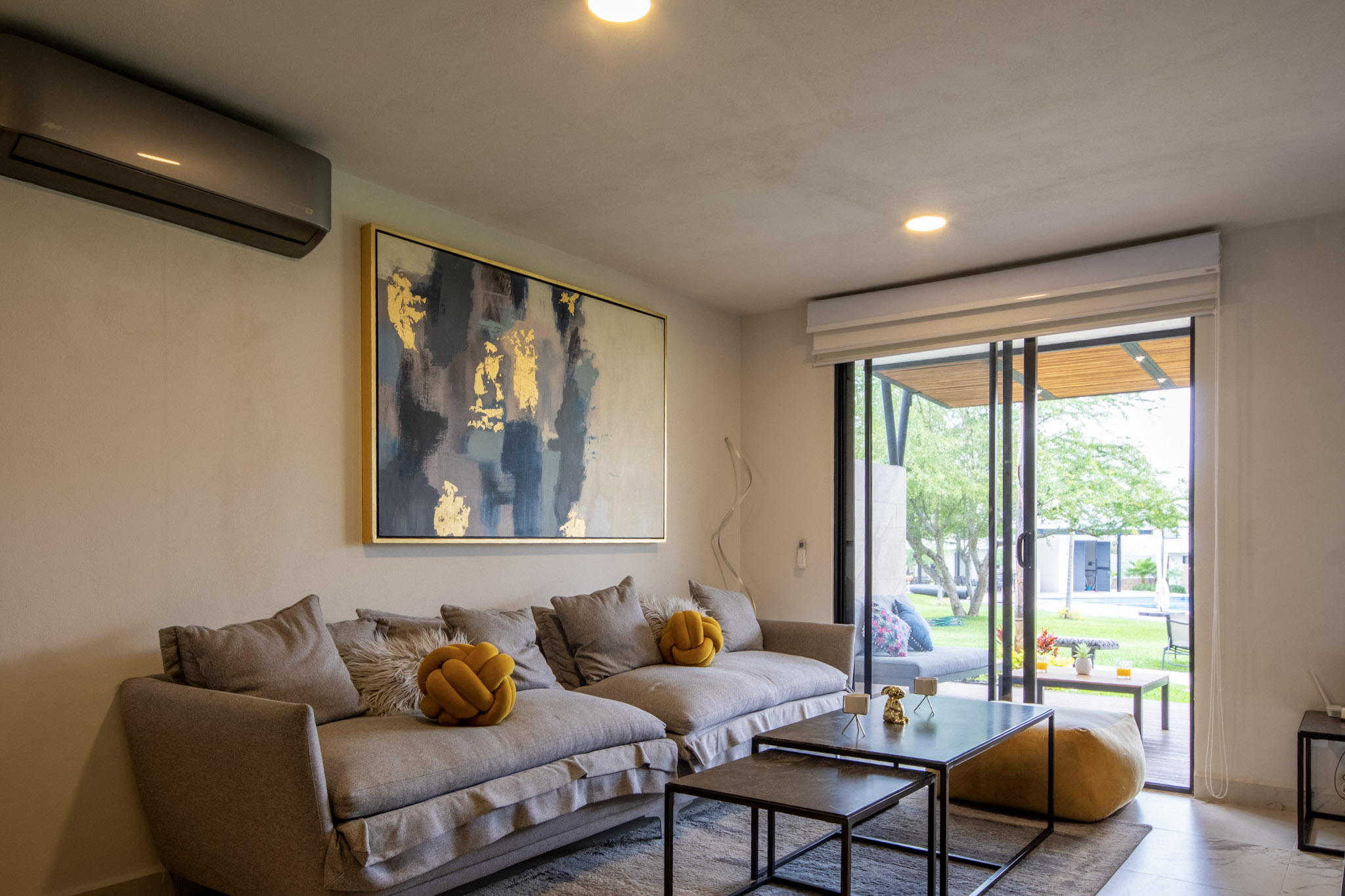 Recamara 1: 1 cama matrimonial, closet con ganchos, baño completo dentro de la habitación, espectacular terraza con vista hacia el jardin y alberca, con un bello sofá y 2 camastros en la terraza.