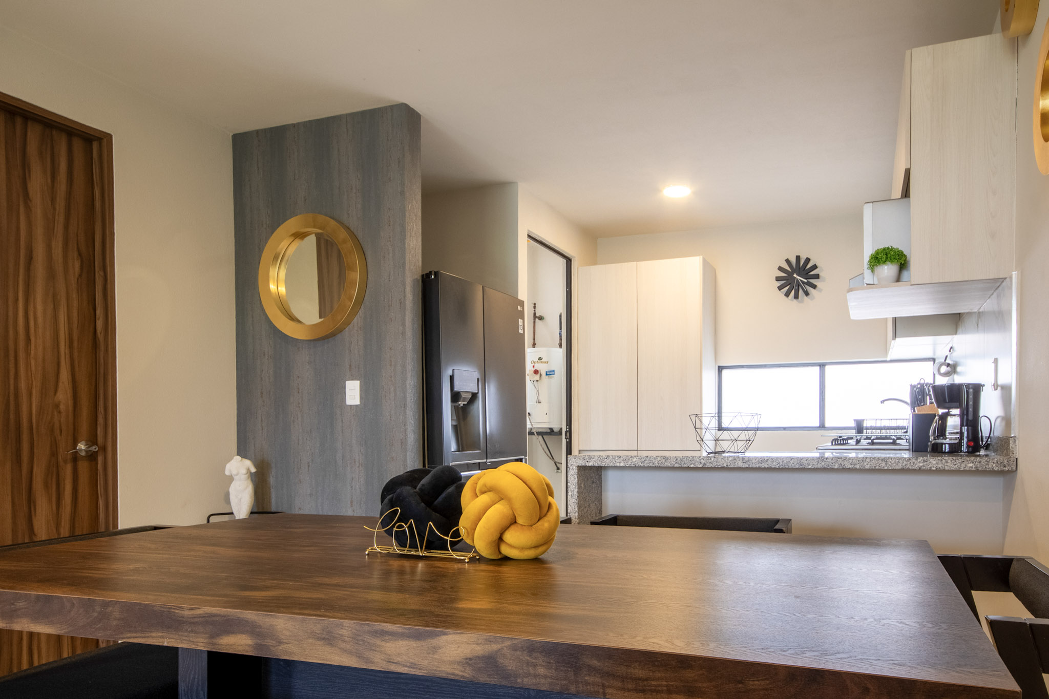 Comedor: Mesa de madera con 4 sillas y una banca.